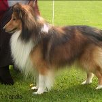 Tak wypielęgnowanego na co dzień owczarka szetlandzkiego nie jest trudno przygotować na wystawę. Odpowiednio wcześnie, (czyli 7-10 dni przed wystawą) kąpiemy psa używając szampony FLUFFY zwiększającego objętość włosa, a następnie mokrego jeszcze, lecz wytartego psa należy spryskać lotionem usztywniającym włos STIFF. Nanosimy go na nasadę włosów podnosząc je warstwami oraz delikatnie spryskujemy całego psa. Na żabot, frędzle oraz na krótki włos na łapach nakładamy PEK. Następnie psa suszymy suszarką i odpowiednio układamy sierść: kryzę i żabot, stopy i miejsca gdzie nałożyliśmy odżywkę PEK suszymy „pod włos”. Sierść na tułowiu, bokach, zadzie, portkach i ogonie układamy „w dół”, również susząc warstwami oraz zgodnie z kierunkiem rośnięcia włosów. Nadajemy psu w ten sposób ładny, równomiernie uporządkowany kształt. Do kąpieli przed wystawami ja osobiście wolę użyć szamponów pogłębiających kolor, nadających mu intensywności i połysku. Szampony te nie koloryzują sierści, a jednocześnie nadają jej odpowiedniej szorstkości. Należy użyć szampony takiego, jaki jest kolor podstawowy okrywy włosowej i nie przejmować się podpaleniami czy białymi znaczeniami. One również nabiorą nieco głębi. Jeżeli jednak pies ma dużo białego użyłabym dwóch szamponów: podstawowego i szamponu do białego, na kryzę, kołnierz a zwłaszcza do łap i ogona gdzie często pojawiają się zażółcenia. Po wysuszeniu korygujemy degażówkami wystające i zniekształcające włosy na łapkach. Włosy nadmiernie wystające za uszami trymujemy po kilka, aby nadać głowie równy kształt. Natomiast u niektórych psów nadmiernie porasta włosem końcówka ucha. Ten włos nadmiernie potrafi obciążyć ucho i daje efekt „ciężkiego”, mocno załamanego ucha. Włosy te, do 1/3 (czyli do miejsca załamania ucha) możemy wytrymować gęstym trymerem lub wyskubać palcami. Tych włosów, jak i tych za uszami w żadnym przypadku nie należy przycinać nożyczkami czy degażówkami. Spowoduje to ich zniszczenie – zmiękczenie włosa, które spowoduje szybsze kołtunienie się sierści w tych miejscach oraz zmianę koloru, rozjaśnienie włosa. Pozostało jeszcze skorygować włos na portkach i ogonie. Najlepiej jest wyskubać po klika najdłuższych, wystające poza całość pojedyncze włosy. Można to ewentualnie zrobić degażówkami, ale należy przede wszystkim pamiętać, że owczarek szetlandzki jest psem pasterskim – ma wyglądać elegancko, ale i bardzo naturalnie.